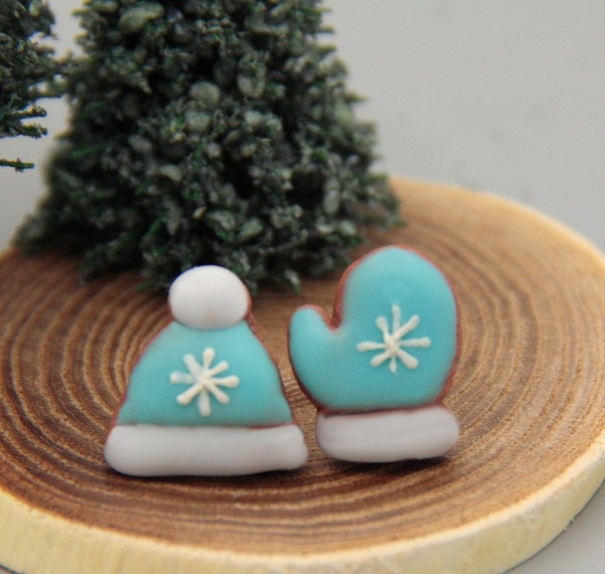 náušnice z polymerové hmoty v podobě perníčků, věrná kopie, zdobeno barevnou polevou a bílým zdobením