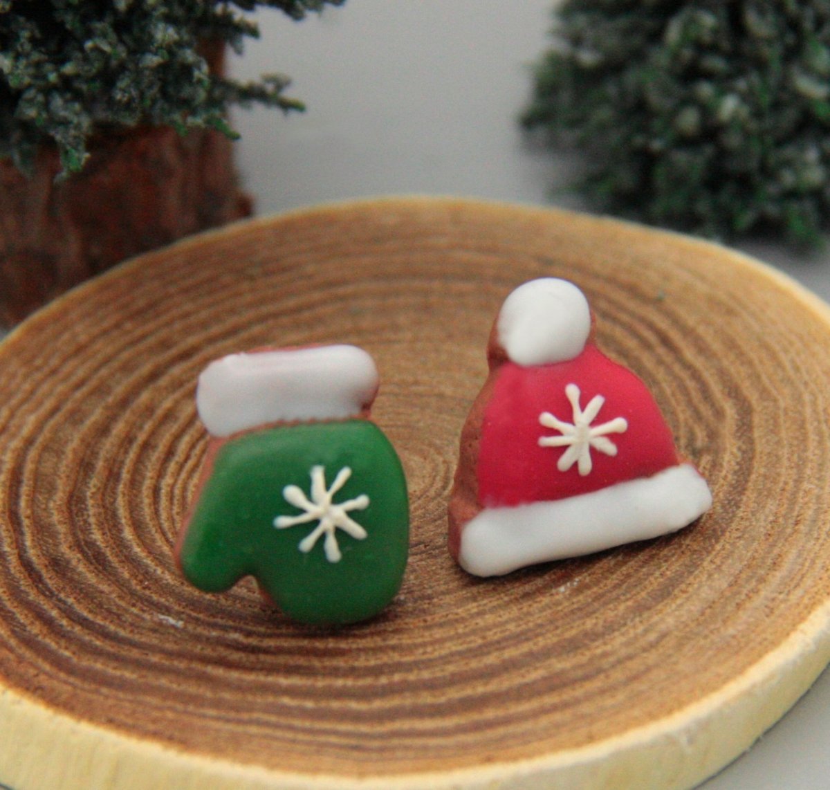 náušnice z polymerové hmoty v podobě perníčků, věrná kopie, zdobeno barevnou polevou a bílým zdobením