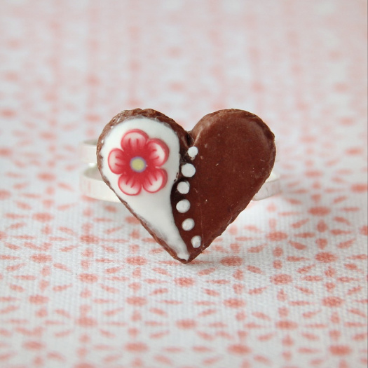 Prstýnek (dětská velikost, základní průměr 1,5cm, roztažitelný) s perníkovým srdíčkem z polymerové hmoty (13x12mm).