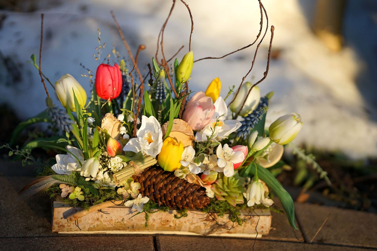 Nízký březový truhlíček a v něm spousta jarních kytiček v kvalitním realistickém zpracování. Květiny jsou převážně latexové a působí živým dojmem, mech je umělý, přírodnini pravé. Dekorace vydrží dlouhé roky. Rozměr 33x16x35 (po špičky větviček)
