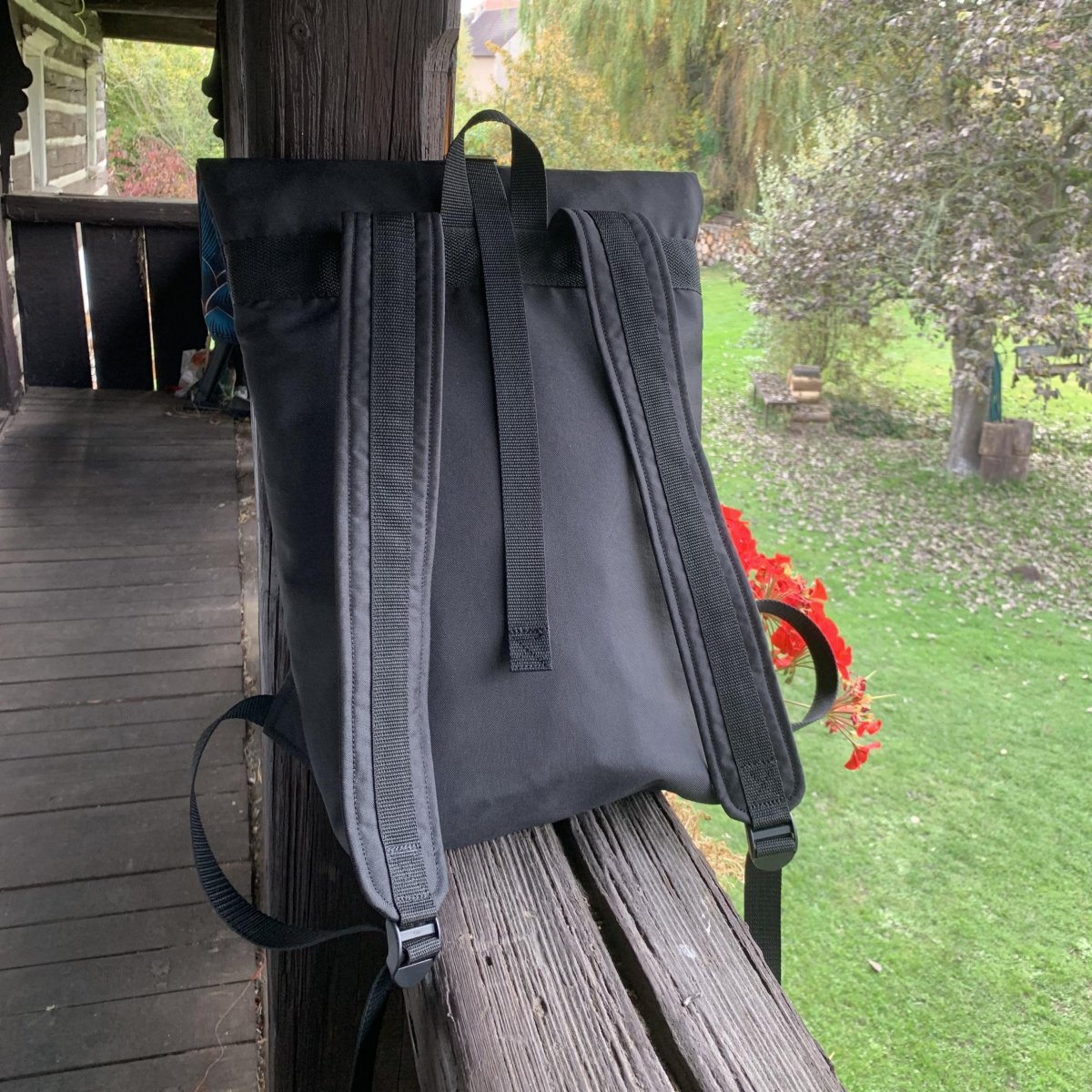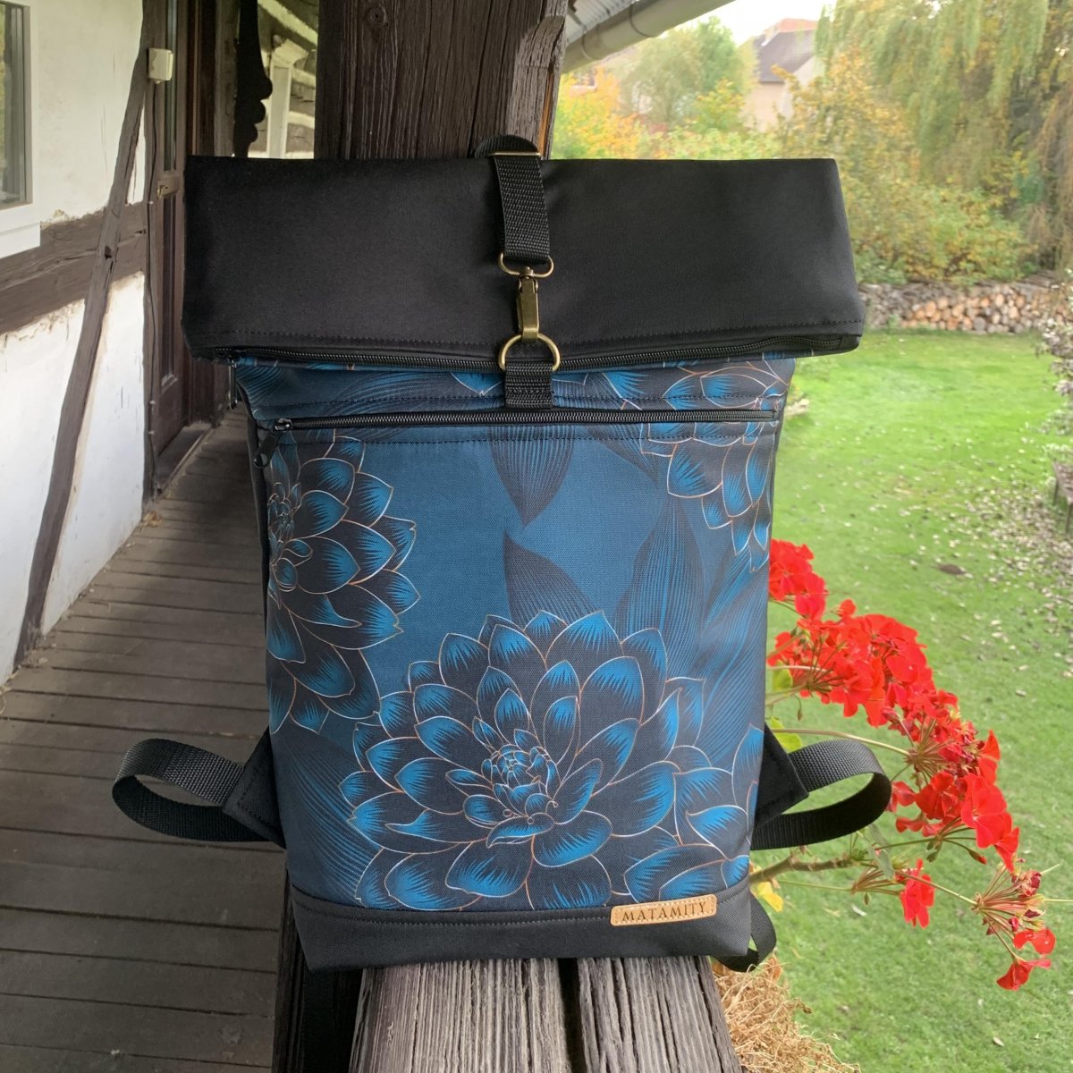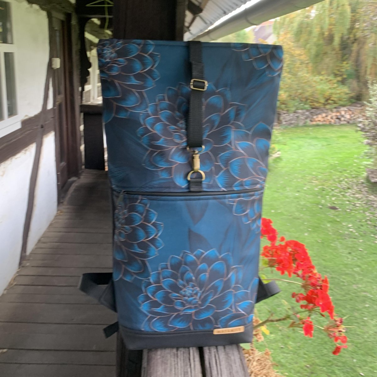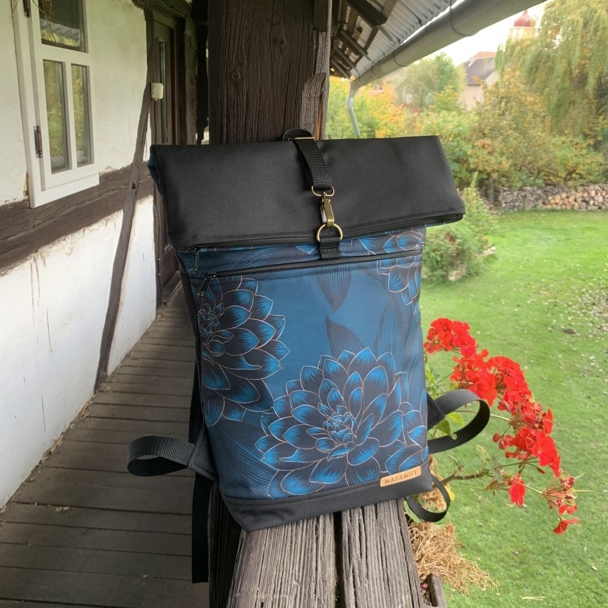 Batoh ušit z voděodolné kočárkoviny černé barvy a vzorované kočárkoviny. Na přední straně je kapsa na zip. Zapínání na zip a karabinu. Batoh ušit na průmyslovém čalounickém stroji, pevnou čalounickou nití.