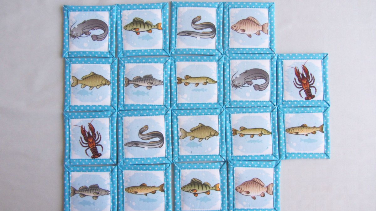 Pexeso, které zabaví na delší čas vaše dětičky a zároveň se naučí znát druhy ryb , které žijí v našich vodách. Pexeso se skládá z 18 kartiček tj. 9 sad, ušitých z EKO bavlny, která je atestovaná pro děti do tří let věku. Kartičky jsou vyztužené ronofixem a vyplněné vatelínem. Velikost kartičky je 8 cm.