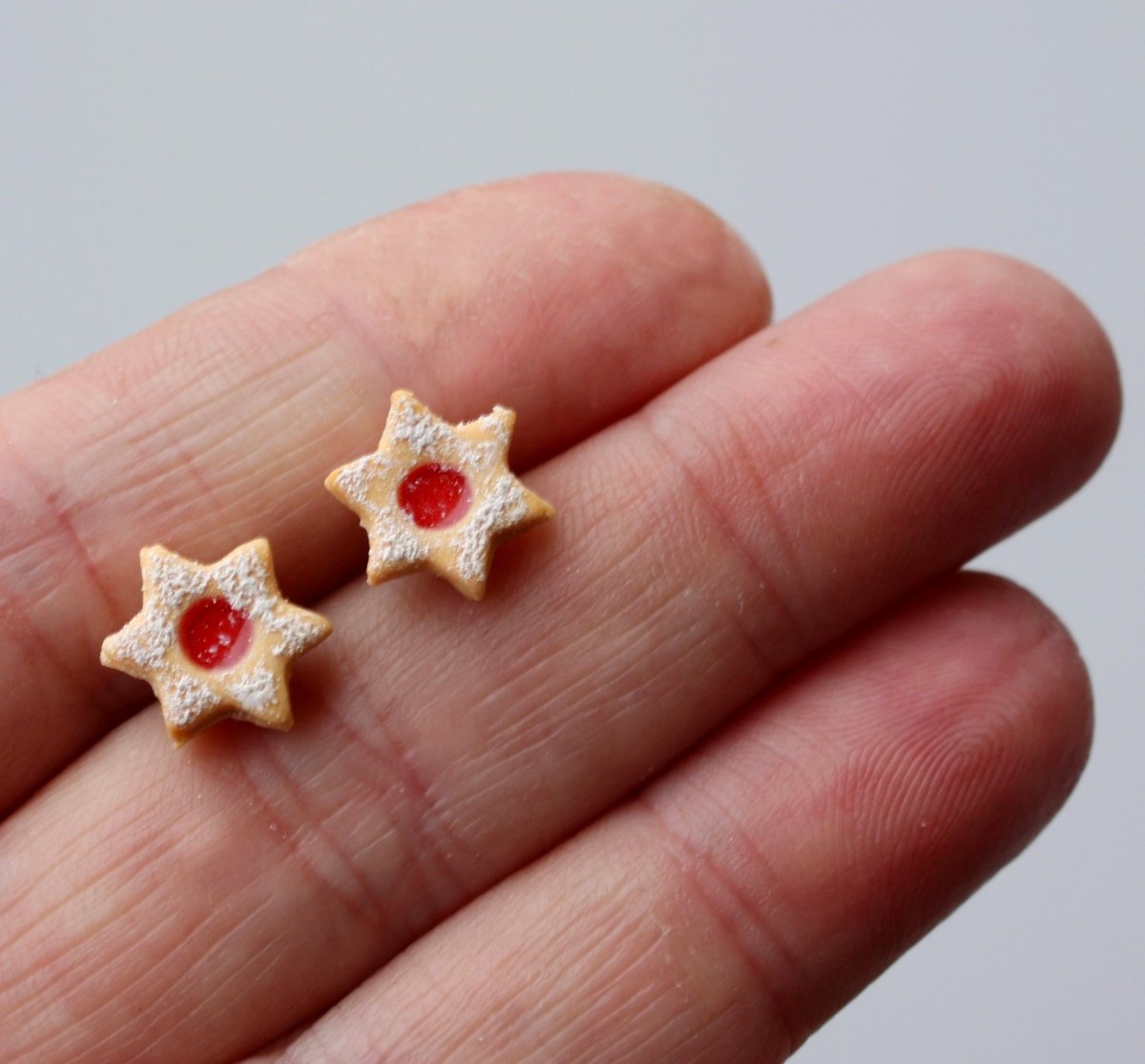 náušnice z polymerové hmoty v podobě lineckého cukroví, na bižuterních puzetkách, průměr 1 cm
