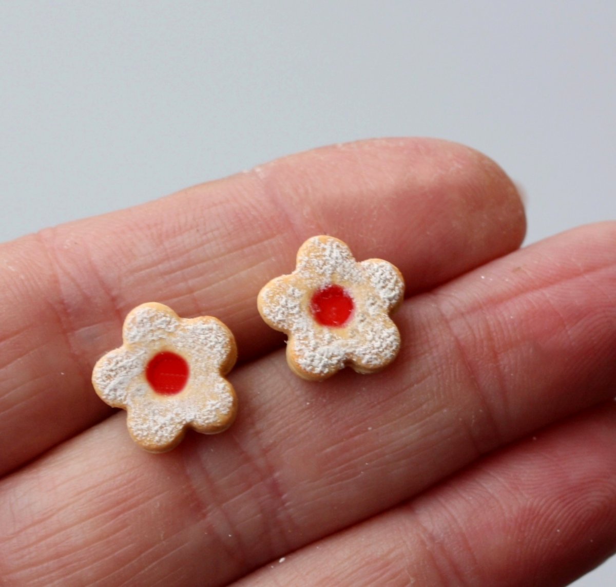 náušnice z polymerové hmoty v podobě lineckého cukroví, na bižuterních puzetkách, průměr 1,2 cm