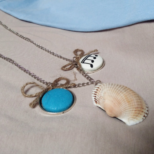 Náhrdelník je vytvořen ze stříbrného řetízku o délce cca 62 cm se zapínáním na karabinku. Řetízek je ozdoben třemi přívěsky: Mušlí a dvěma buttonky o průměru 23 mm dozdobenými provázkem.