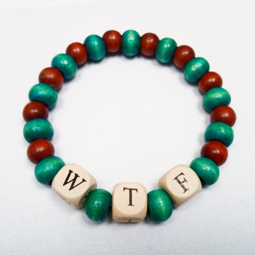 Náramek z různých druhů dřevěných korálků a nápisem WTF. Korálky jsou navlečeny na bílé pružence. Délka přibližně 18 cm.