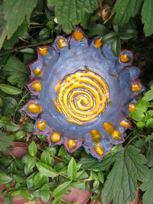 ručně modelovaná misky dno je opatřeno žlutou spirálkou, hroty též, vhodné jako dekorace jak do bytu, tak na zahradu - využít jako pítko pro ptáčky, výška 6cm, délka 15cm, barva modrá