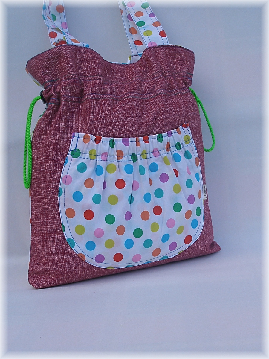 z jedné strany jednobarevná režně vínová s kapsou,z druhé puntíkatá s aplikací