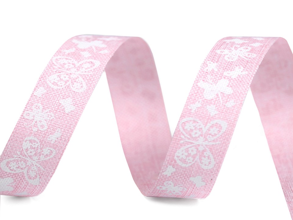 Plátnová stuha s potiskem motýlů má jednostranný potisk. Šíře stuhy je 15 mm. Uvedená cena je za 1 metr.