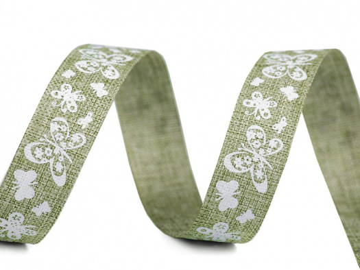 Plátnová stuha s potiskem motýlů má jednostranný potisk. Šíře stuhy je 15 mm. Uvedená cena je za 1 metr.
