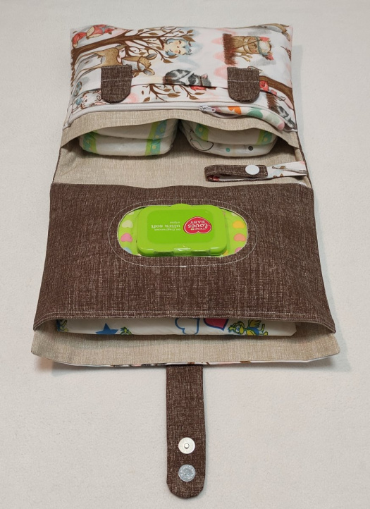 Pod kapsou s vlhčenými ubrousky je velká kapsa (rozměry 18 x 27 cm), do které se vejde přebalovací podložka.