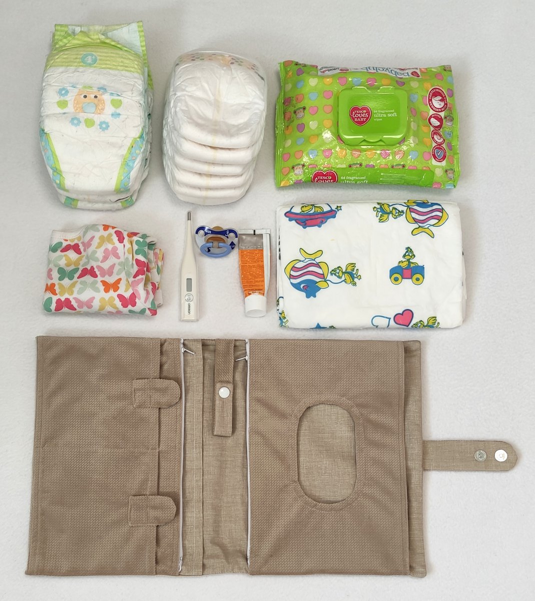 Do tohoto plenkovníku 4 v 1 uložíte 4 ks papírových plen o velikosti 4+ a 4 látkové pleny (nebo místo látkových plen zde uložíte 6 ks nejmenších papírových plen), vlhčené ubrousky, přebalovací podložku, body triko a případně tubu s krémem a teploměr.
