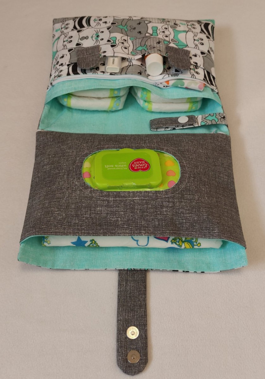 Pod kapsou s vlhčenými ubrousky je velká kapsa (rozměry 18 x 27 cm), do které se vejde přebalovací podložka.