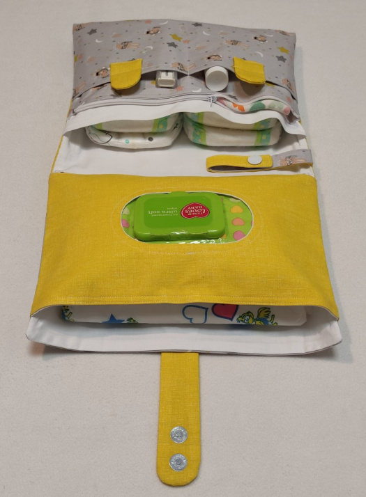 Pod kapsou s vlhčenými ubrousky je velká kapsa (rozměry 18 x 27 cm), do které se vejde přebalovací podložka.