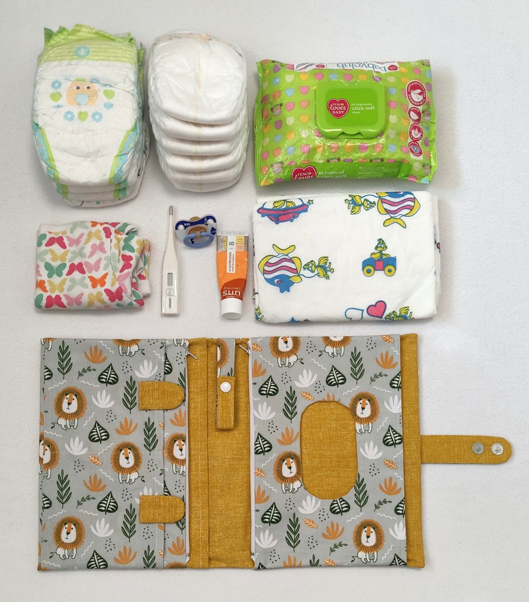 Do tohoto plenkovníku 6 v 1 uložíte 4 ks papírových plen o velikosti 4+ a 4 látkové pleny (nebo místo látkových plen zde uložíte 6 ks nejmenších papírových plen), vlhčené ubrousky, přebalovací podložku, body triko a případně tubu s krémem a teploměr.
