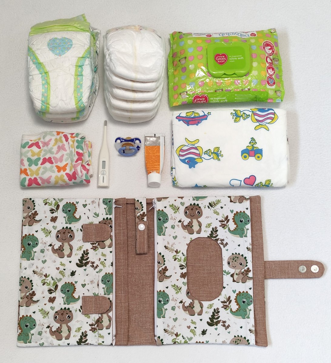 Do tohoto plenkovníku 6 v 1 uložíte 4 ks papírových plen o velikosti 4+ a 4 látkové pleny (nebo místo látkových plen zde uložíte 6 ks nejmenších papírových plen), vlhčené ubrousky, přebalovací podložku, body triko a případně tubu s krémem a teploměr.