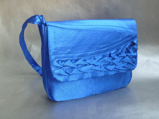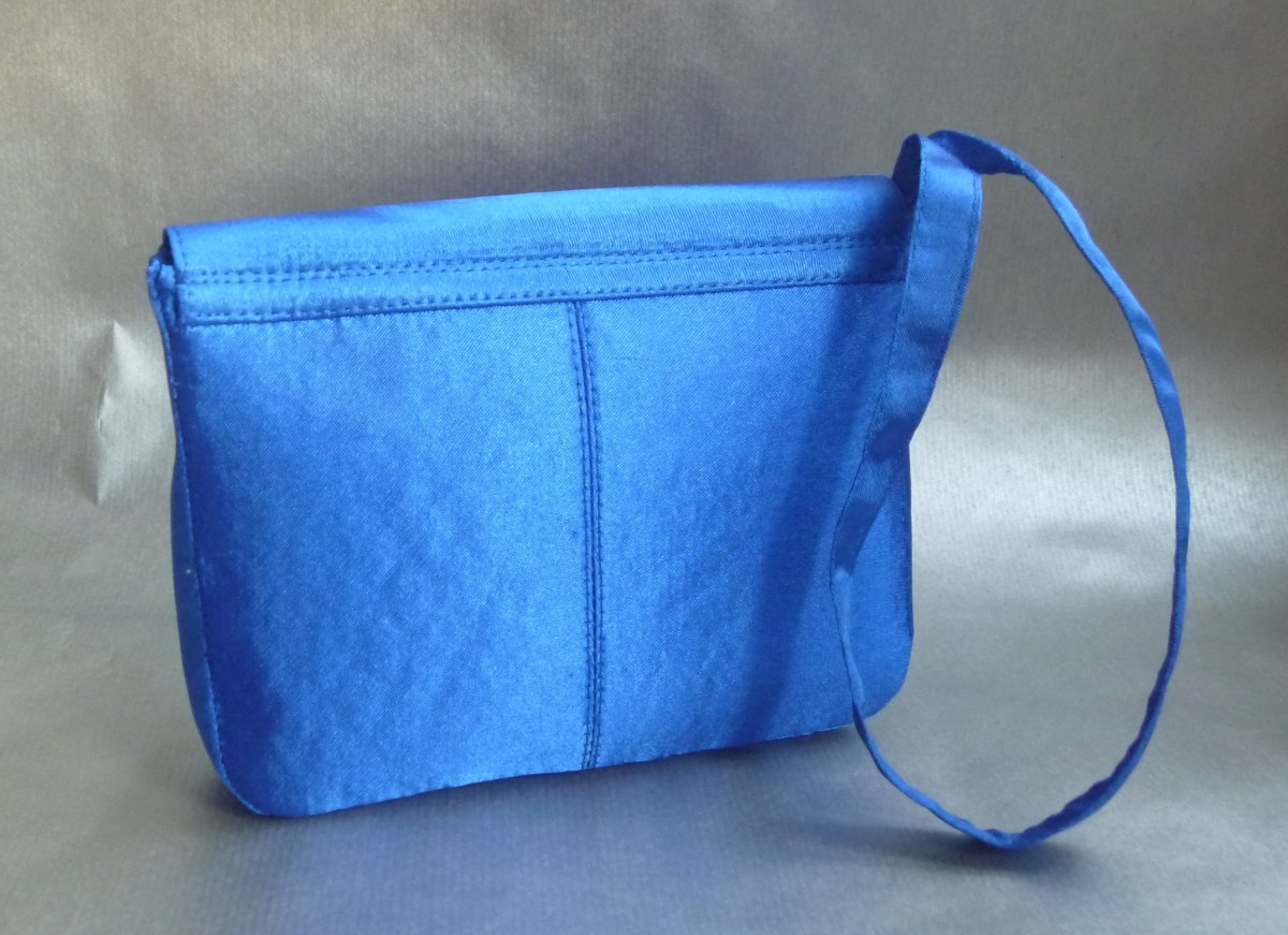 Kabelka je ušita z tmavě modrého saténu zapínaná na magnetické zapínání. Šířka kabelky je 16,5 cm, výška 13 cm, tlouštka v nejširším místě dna 5cm. Kabelka má ucho dlouhé 20 cm (polovina) s možností schování do kabelky.
