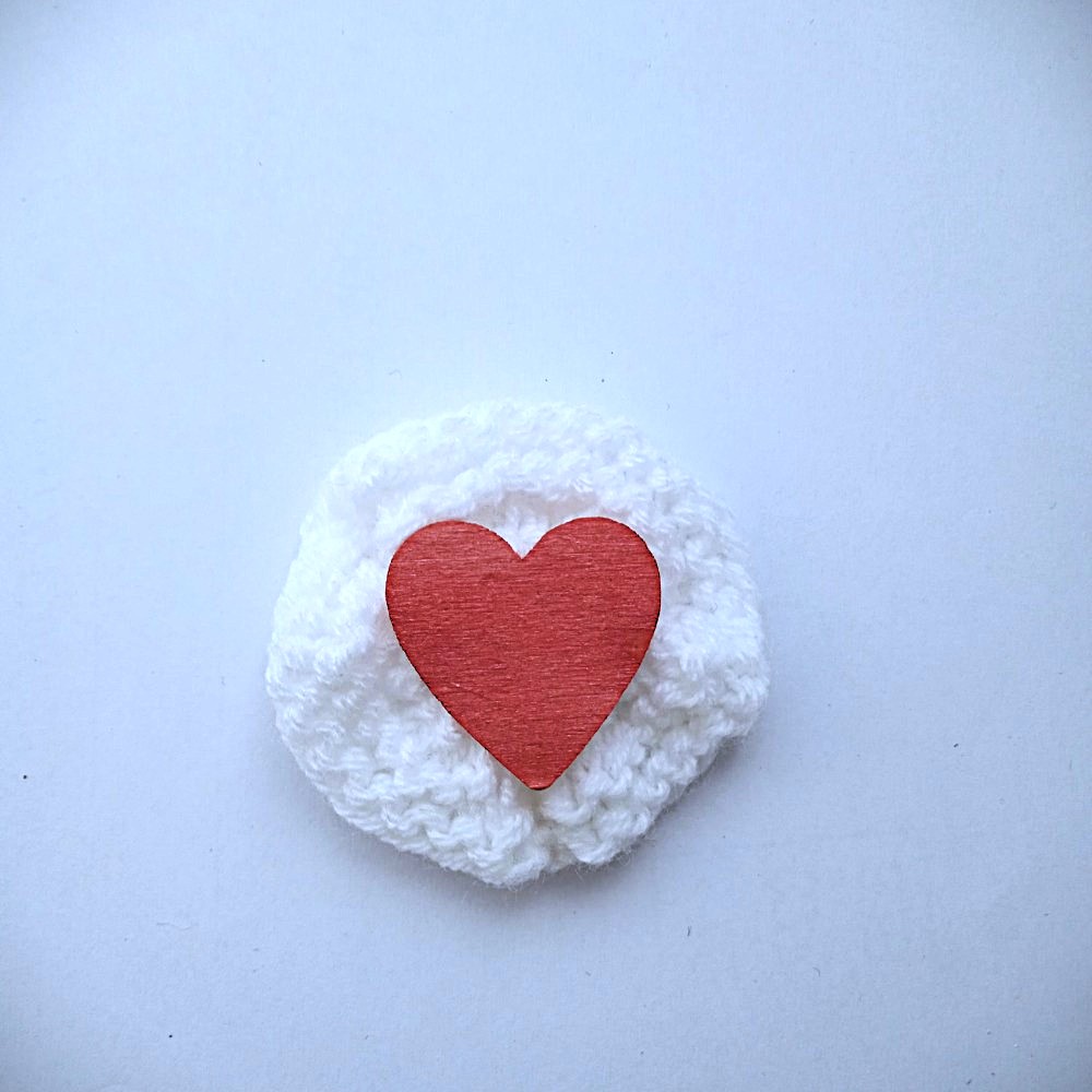 Pletená brož se srdíčkem, průměr 6 cm, přišitý brožový můstek z bižuterního kovu.