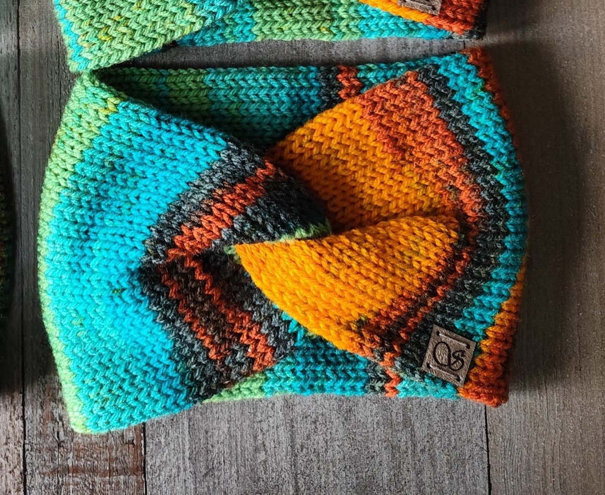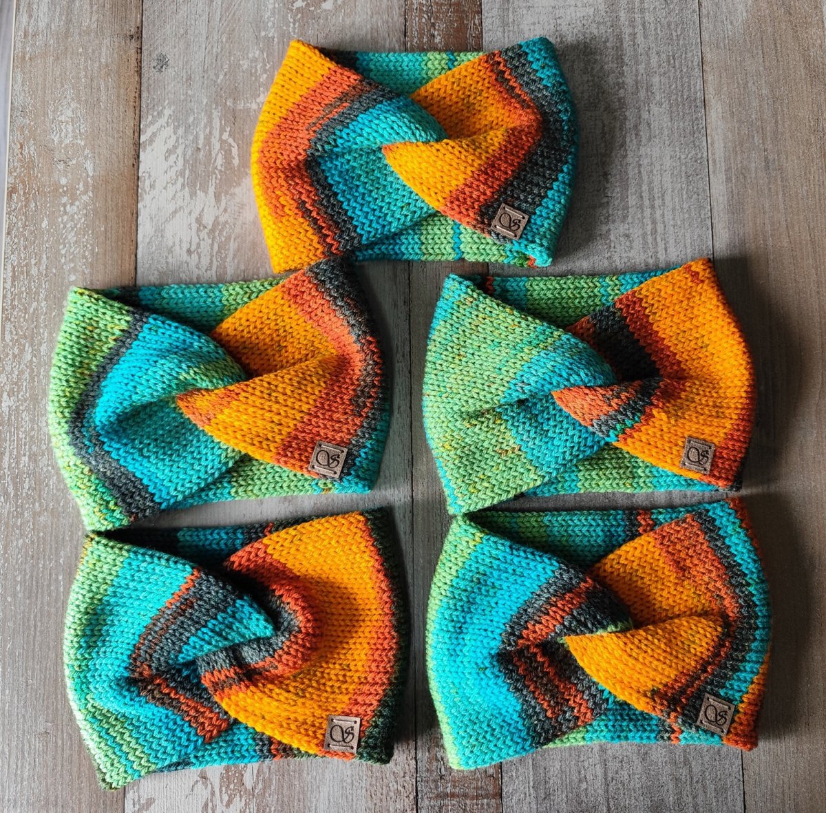 Díky batikované přízi je každá čelenka trošičku jiná. Každá je dozdobena semišovým štítkem s naším logem, které lze snadno odstřihnout.