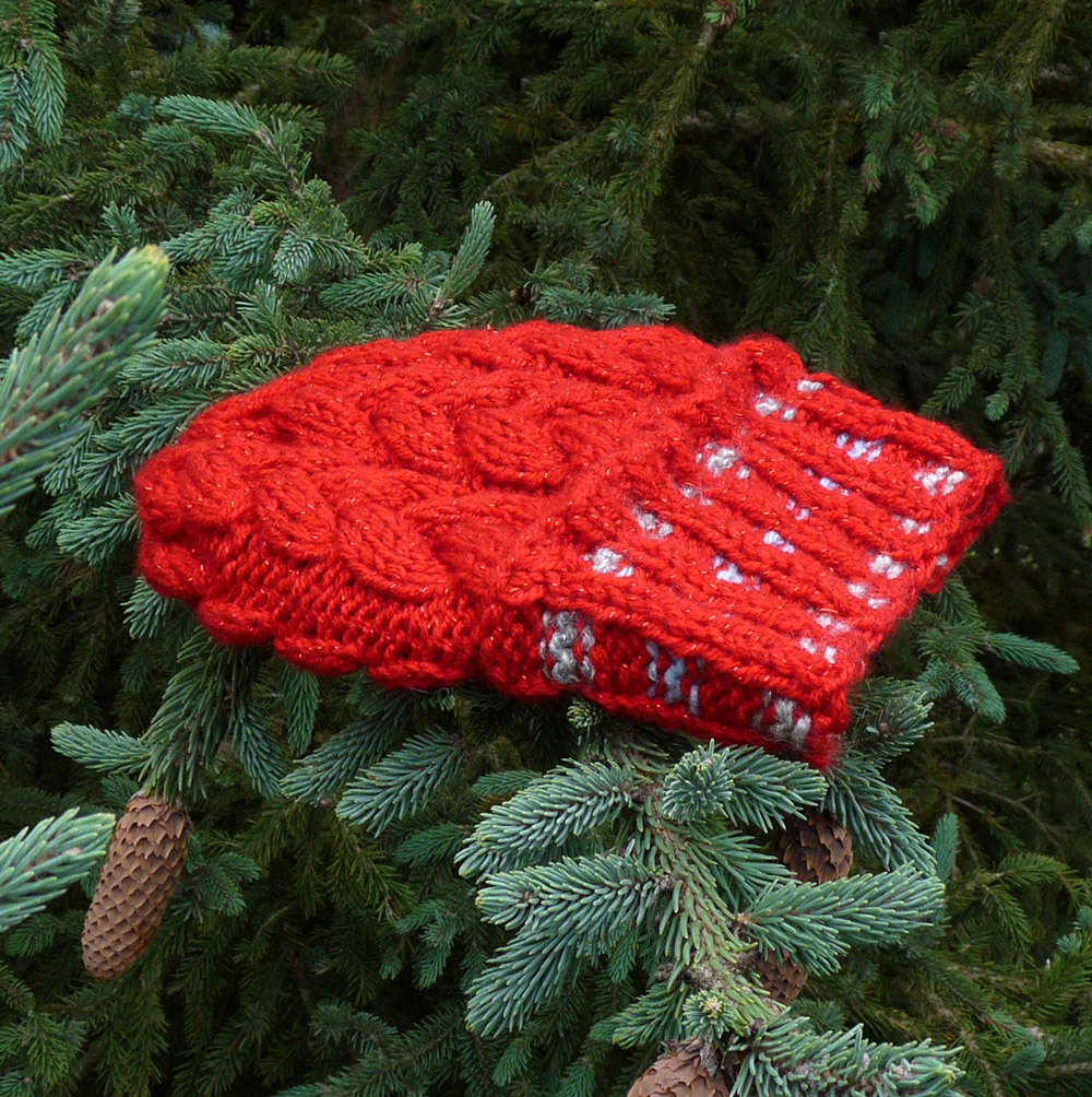 Čepice je pletená ze dvou přízí - z akrylu a směsové příze s vlnou, mohérem a červeně se třpytícím metalickým vláknem.