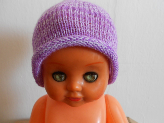 Strojově pletená čepička s ručním dokončením vhodná pro miminko nebo pro panenku. Obvod v klidu 39cm, délka 16cm. Čepička je pružná, dole má stočený lem, fialovo-bílý melír. Materiál 100% akryl. Doporučuji ruční praní nebo v pračce program na vlnu.