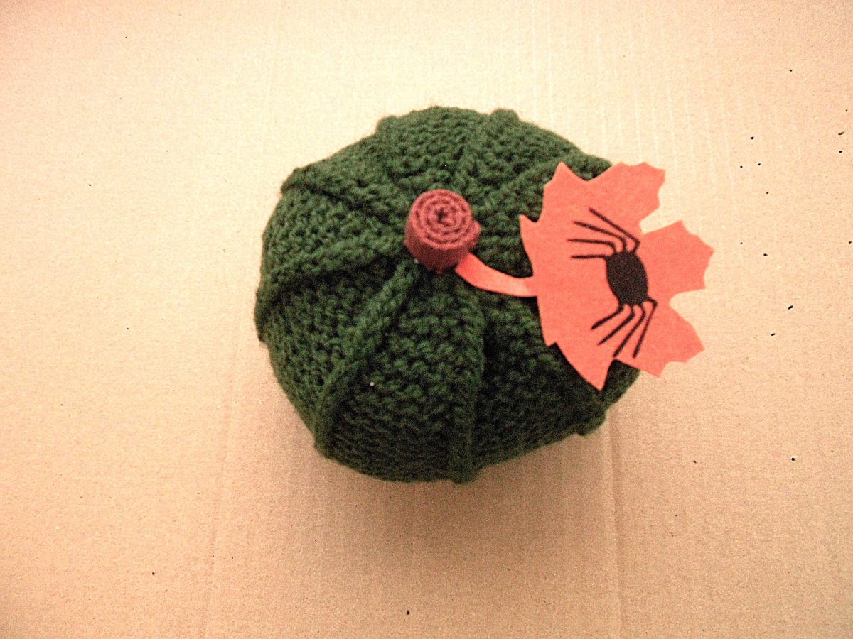 Ručně pletená dýně průměr 38 cm, výška bez stopky 9 cm, plněná vatelínem, barva khaki, lístek je sytě oranžový.