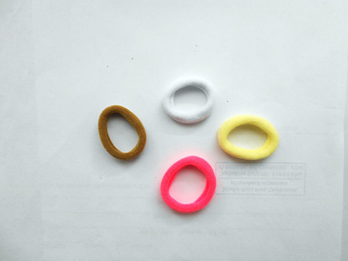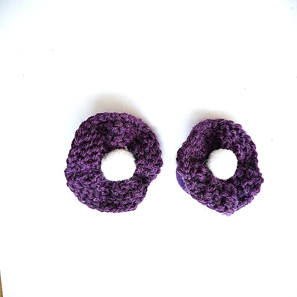 Fialová pletená gumička do vlasů. Pletená kytička, i gumička jsou přilepené na riflovině pro větší pevnost. Průměr kytičky je 6cm, průměr gumičky 2,5 cm, gumička je jemná, na dvojí otočení, viz. 2. fografie.