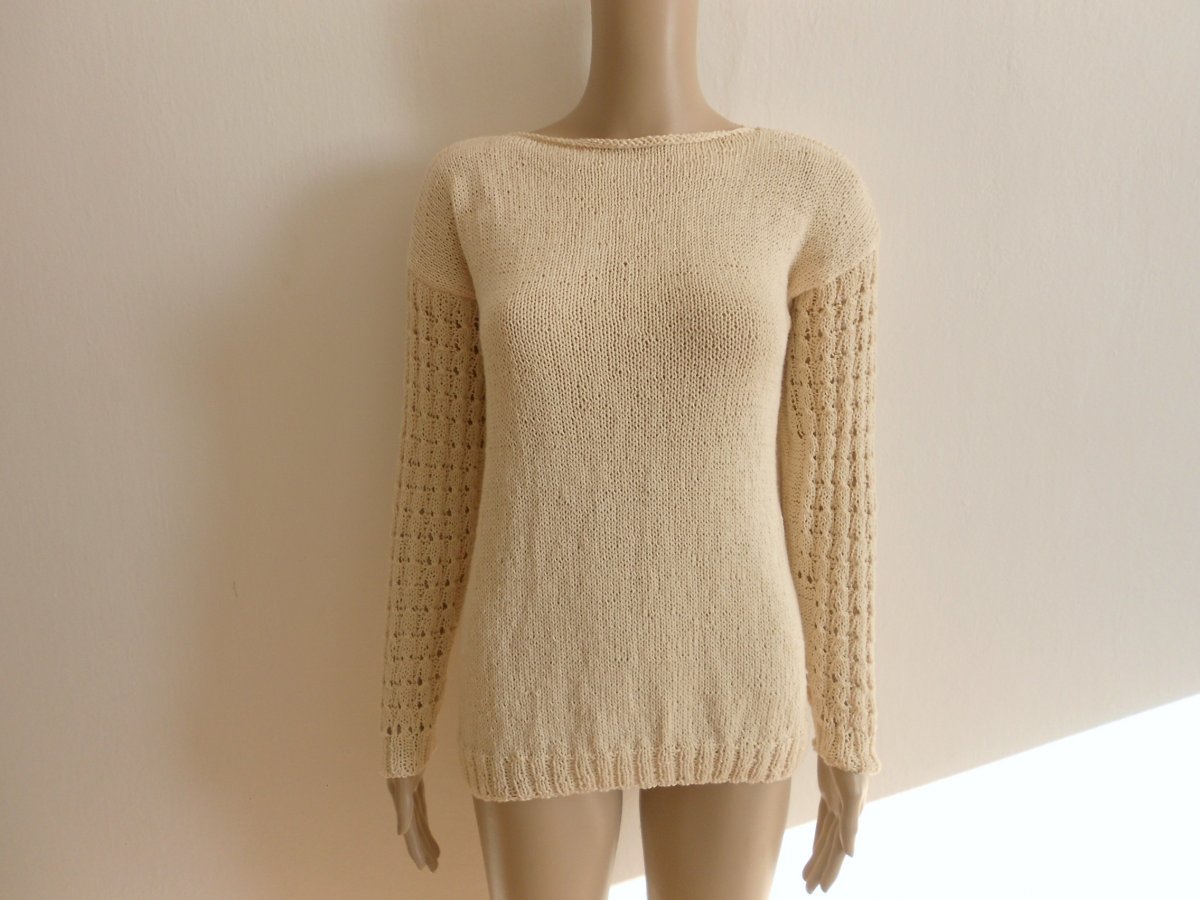 Dámská, ručně pletená halenka, 100% bavlna. Lodičkový výstřih, který umožňuje různé způsoby nošení. Velikost S,M,: délka 60 cm, šířka 47cm, vnitřní délka rukávu 48 cm. Doporučuji jemné praní a sušit volně položené.