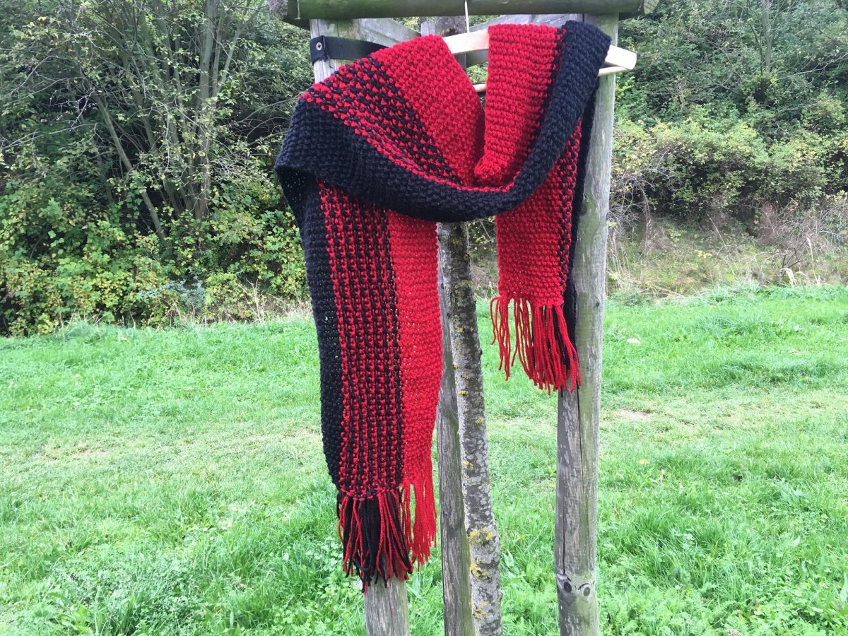 Ve dvou výraznývch barvách, černé a sytě červené je upletená šála, kterou na podzim a v zimě užijí dámy, možná i odvážnější pánové.