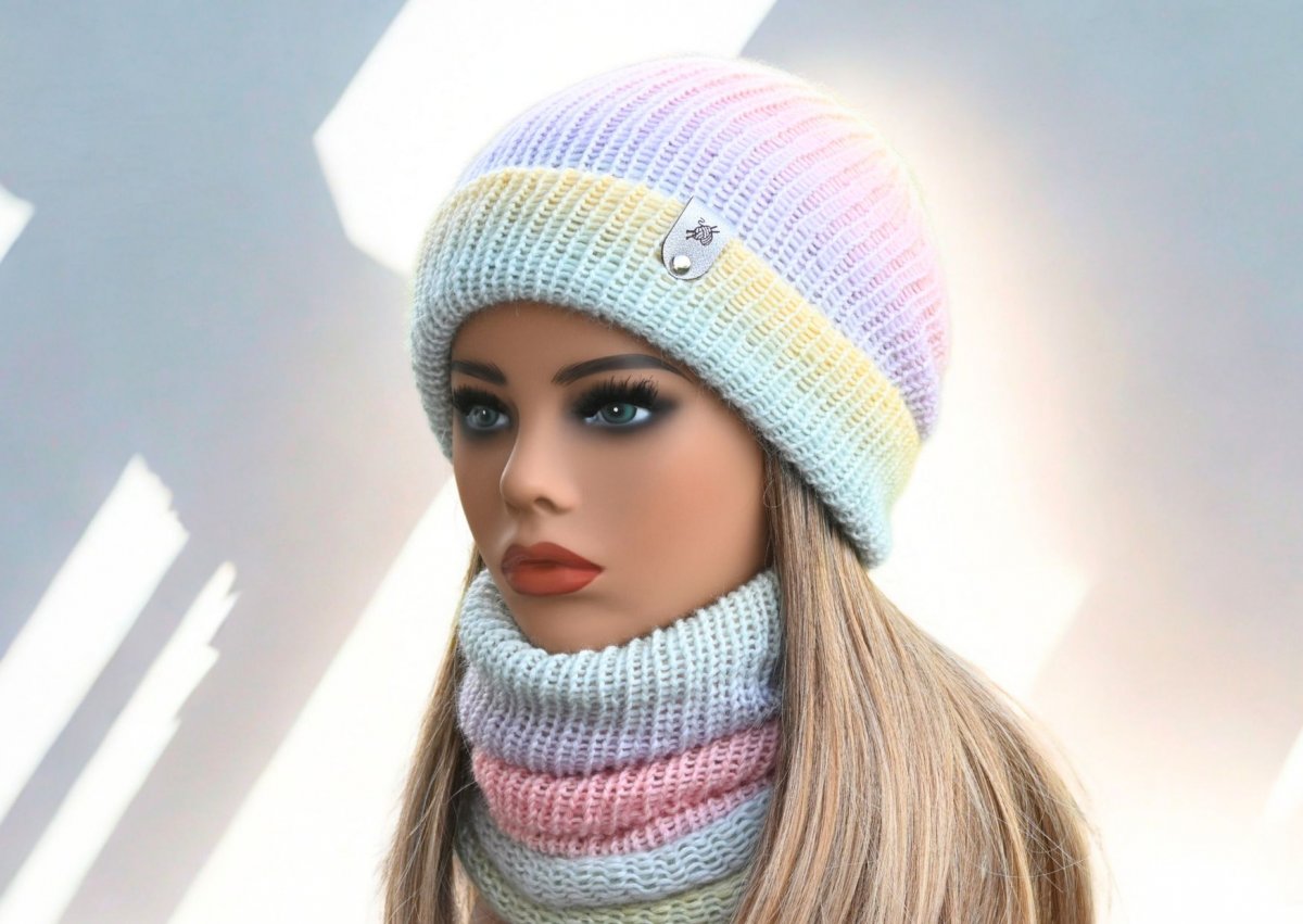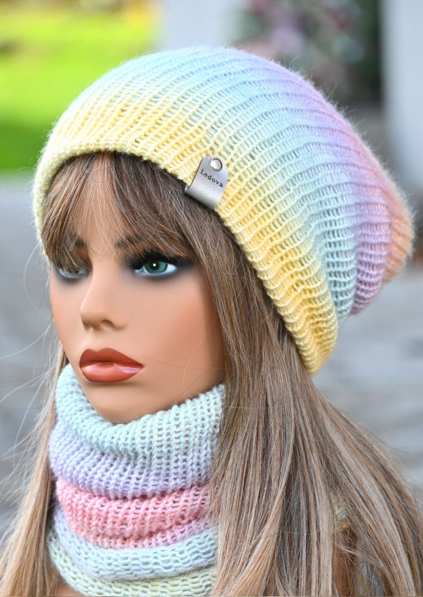 Pletená čepice s nákrčníkem – hřejivý set pro zimní dny v nádherných duhových barvách s jemnými přechody barev