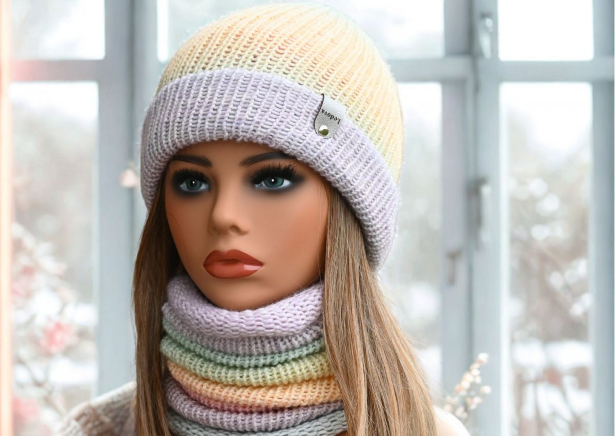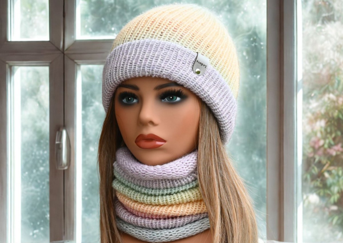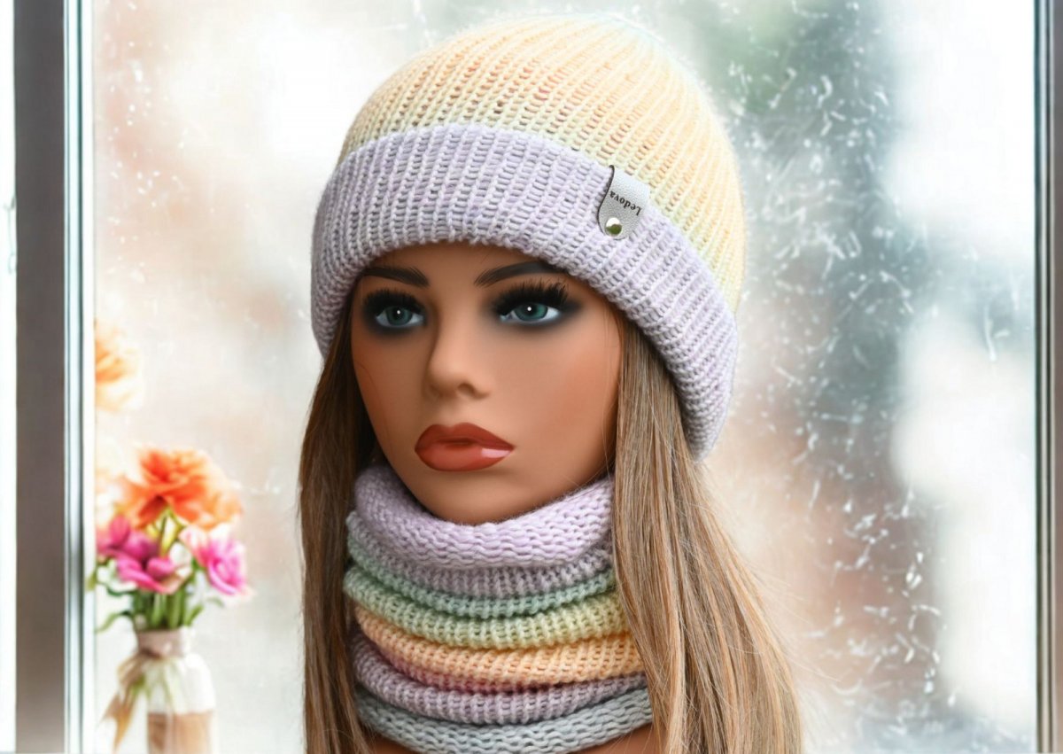 Pletená čepice s nákrčníkem – hřejivý set pro zimní dny v nádherných duhových barvách s jemnými přechody barev