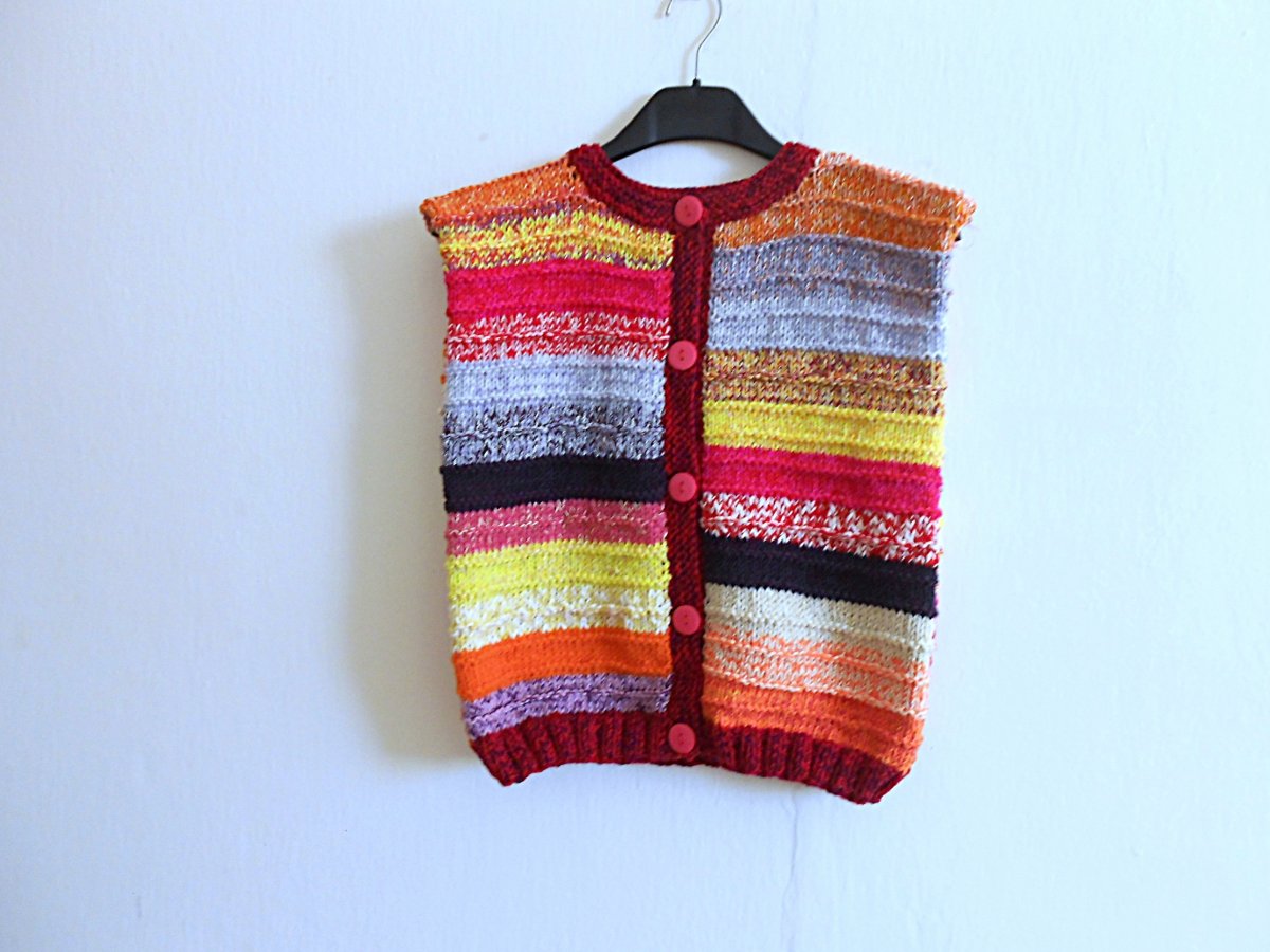 Kojenecká ručně pletená vestička, velikosti 110-116, délka 43cm, šířka 38 cm. Materiál: 50% merino, 20% akryl, 20% vlna, 10% bavlna.
