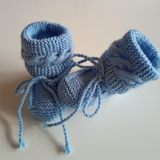 Ručně pletené modré bačkůrky. Délka chodidélka 10 cm. Pletené z akrylové příze.