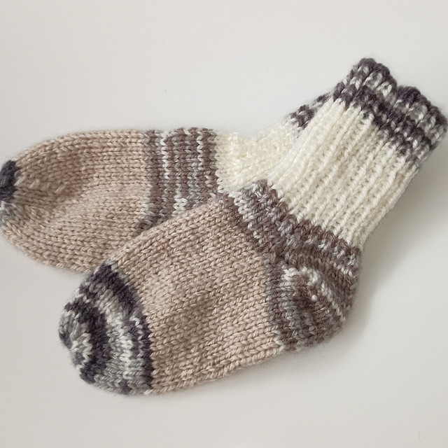 Ručně pletené ponožtičky na pěti jehlicích - bezešvé. Délka chodidélka 12 cm, šíře chodidélka 7 cm, délka rantliku 9 cm (vše měřeno nenatažené). Pleteno z akrylové příze.