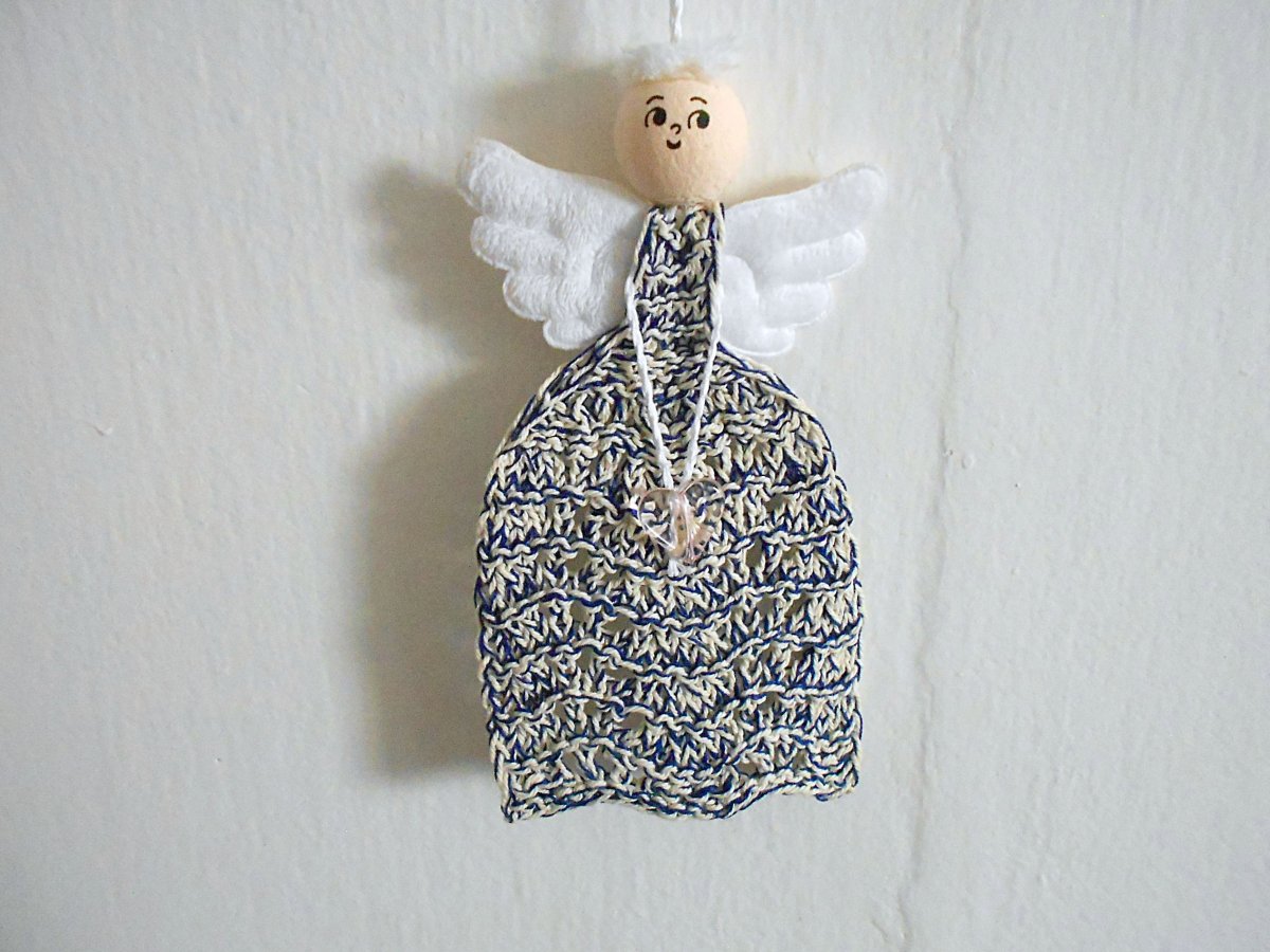 Ručně pletený béžovo-modrý andělíček s růžovým srdíčkem, podle vlastního návrhu. Velikost: výška bez šňůrky na zavěšení 19 cm, šířka 11 cm, mírně naškrobený, ale drží tvar i bez škrobení.