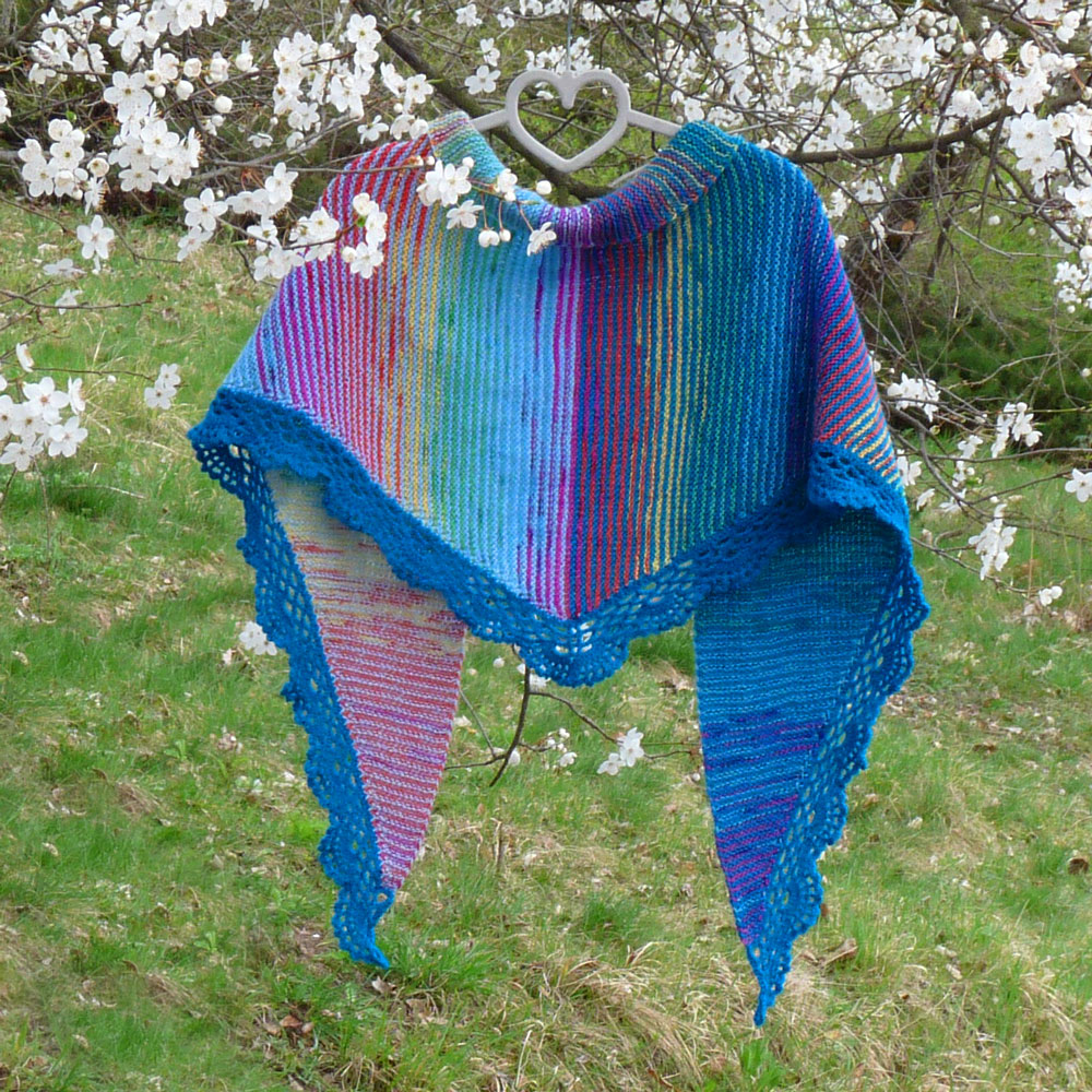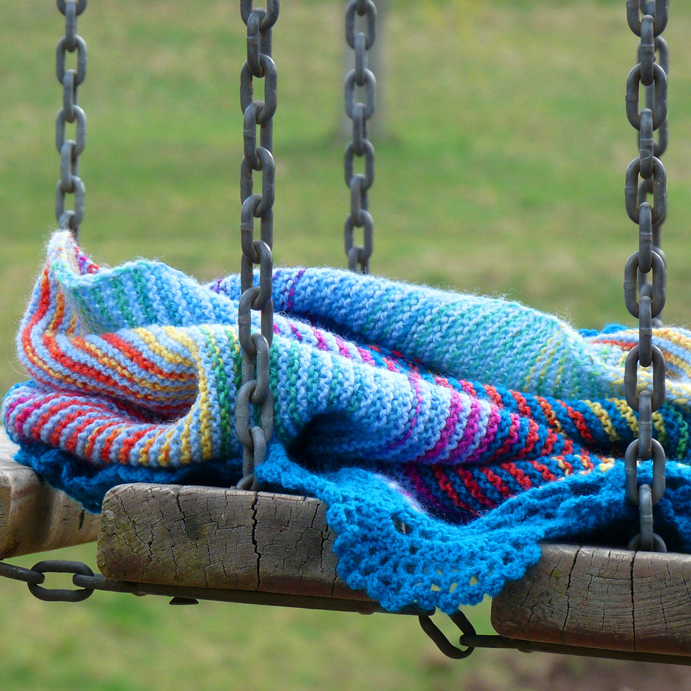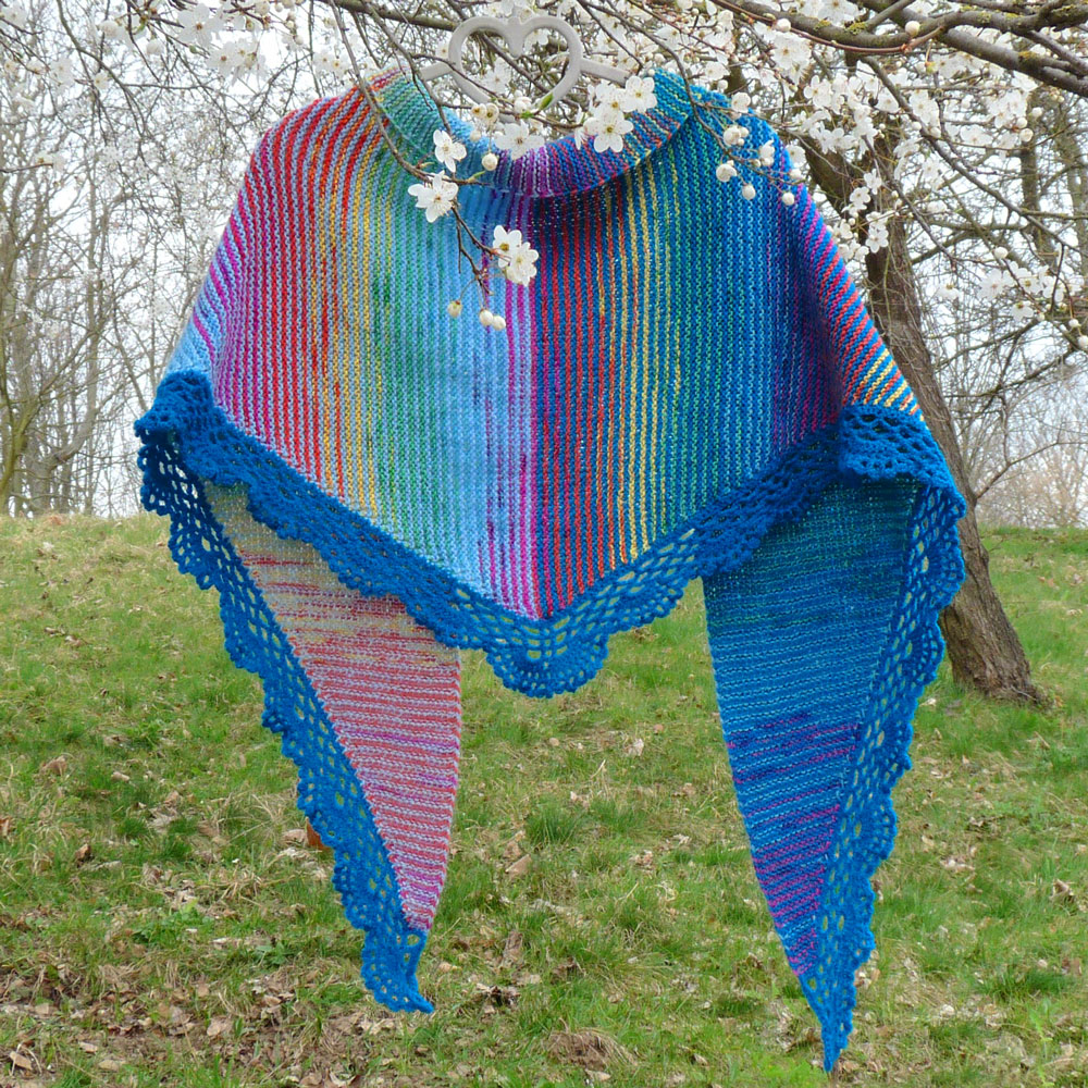 Ručně pletený šátek v duhových barvách na modrém podkladu