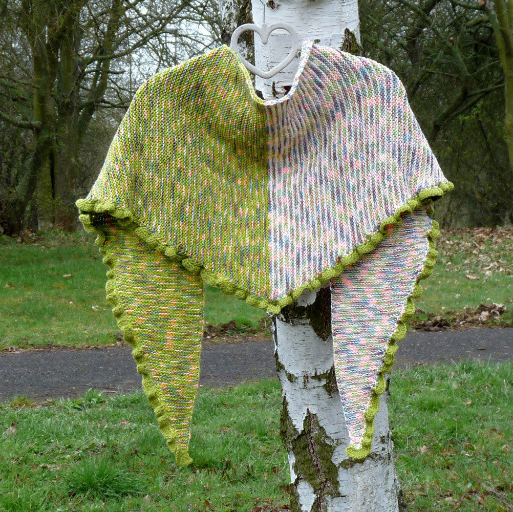 Jedna polovina šátku připomíná záhony tulipánů na zahradě, druhou část tvoří tulipány s popraškem sněhu