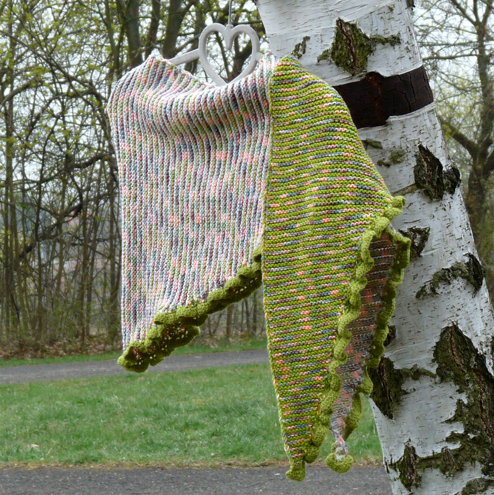 Šátek je obháčkovaný zelenou přízí, která tvoří zvlněný okraj