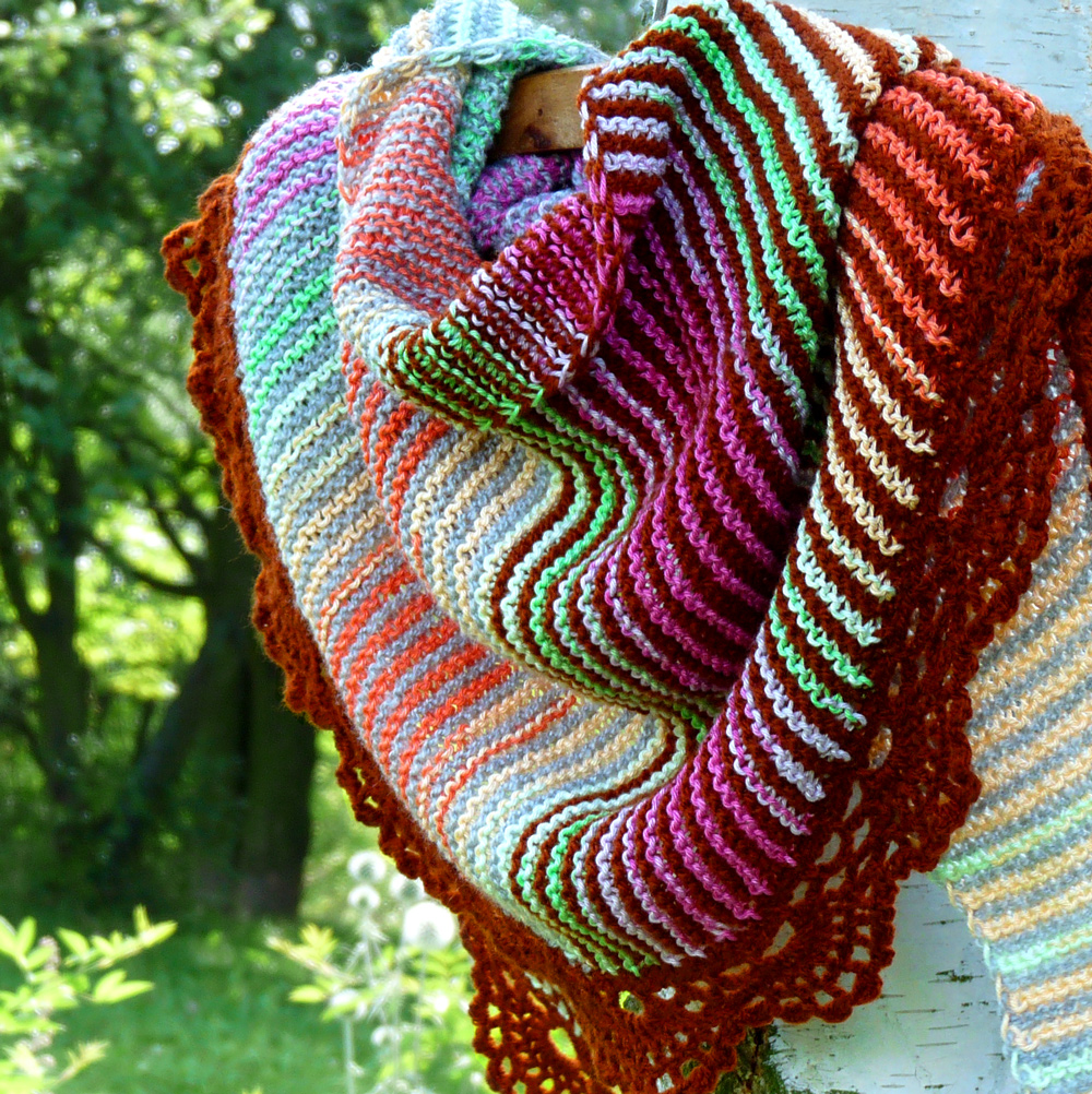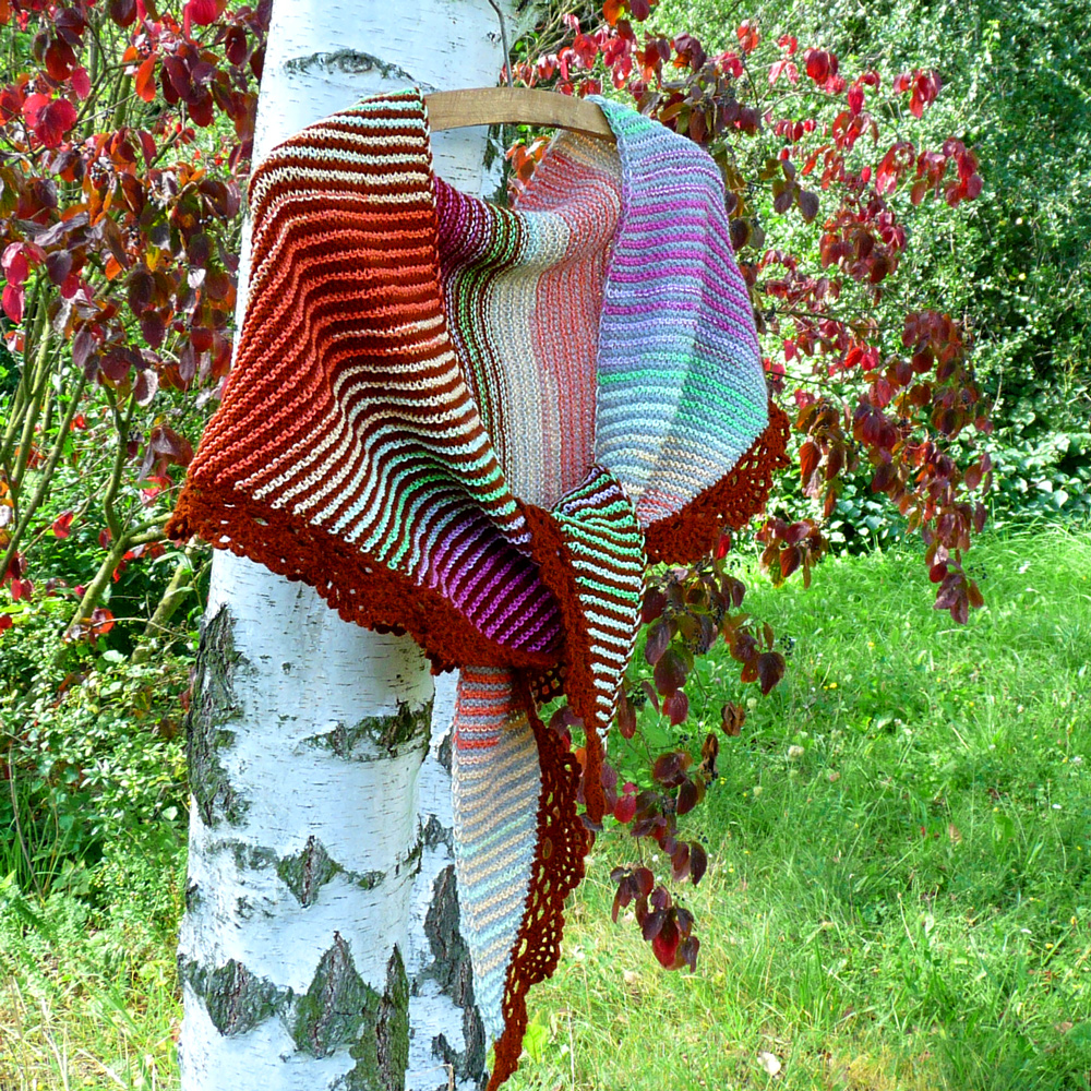 Polovina šátku je výrazná, veselá, podzimní, druhá polovina je pak v jemném našedlém tónu prvního přízemního mrazíku