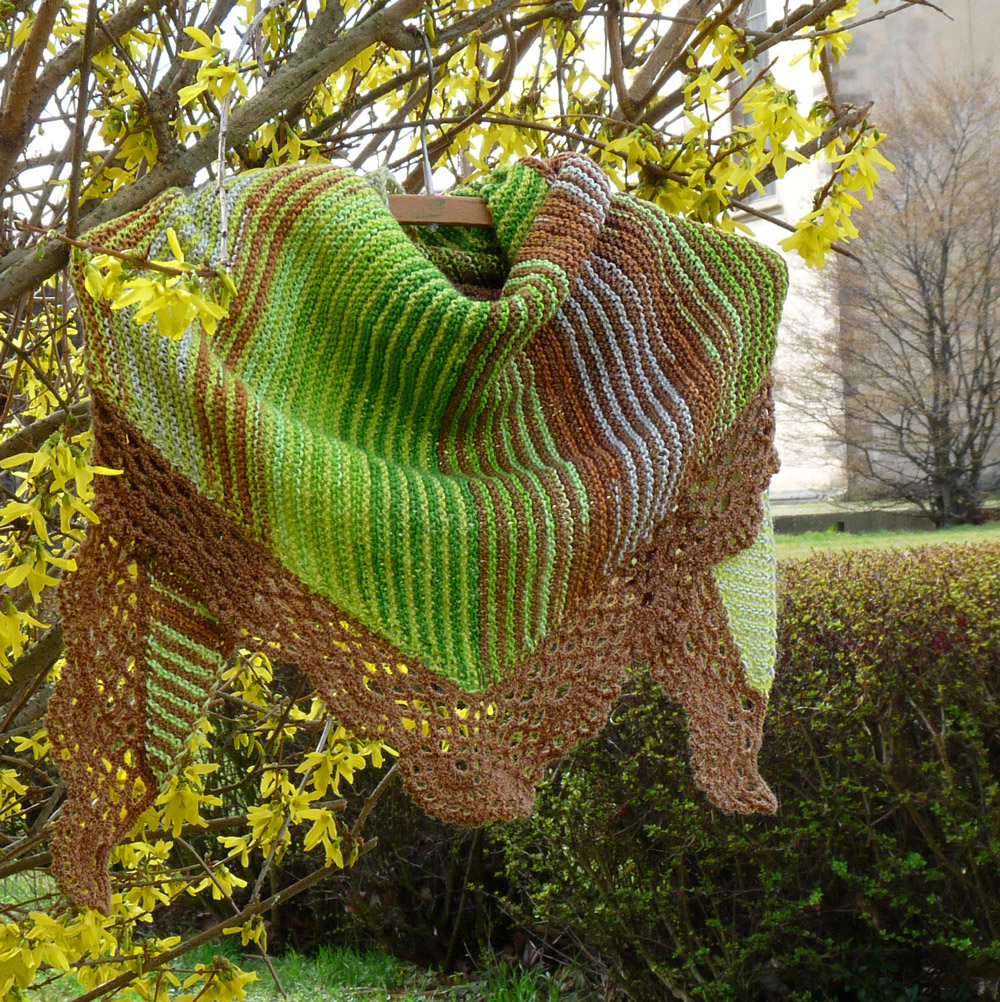 Ručně pletený šátek v hnědozelených barvách, tentokrát inspirovaný jarní zelení