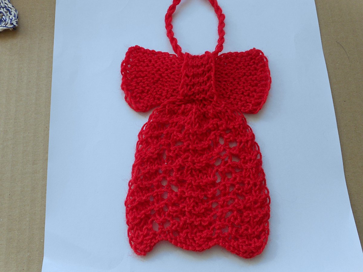 Ručně pletený zvoneček k zavěšení, podle vlastního návrhu. Velikost: výška bez šňůrky na zavěšení 14 cm, šířka 11 cm, mírně naškrobený, ale drží tvar i bez škrobení.