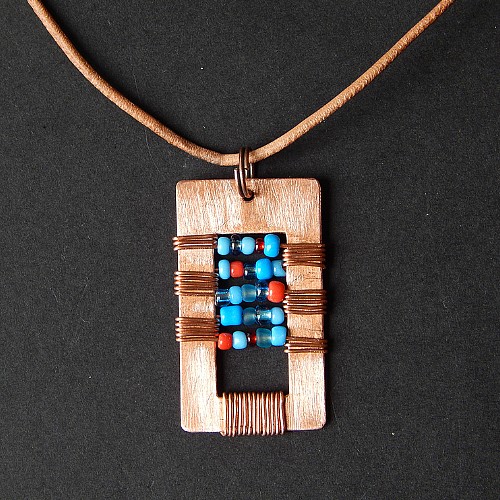 Měděný plech,skleněné korálky.Délku a druh závěsu je možné upřesnit v objednávce.Lze vyrobit i náušnice. Rozměr 36x22mm