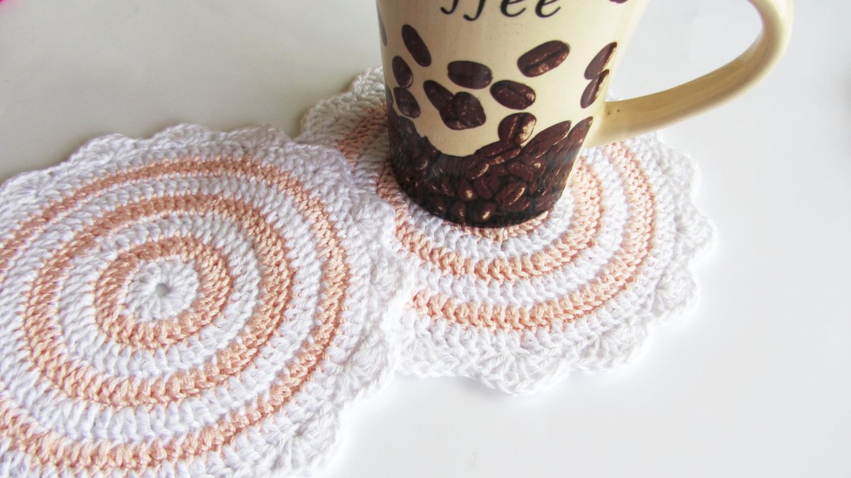 Háčkované prostírání pro milenecký pár ve dvou. Podkafíčka jsou háčkavaná z bavlněné a směsové příze. Velikost je 14 cm. Prostírání je napařeno žehličkou přes vlhké plátno.