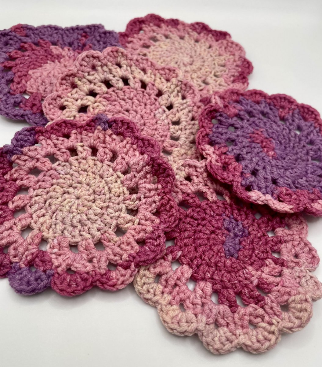 Šest růžovofialových kousků podšálků. Podšálky jsou háčkované z jedné příze, ale protože byla báječně divoce žíhaná, je každý úplně jiný a originální.
