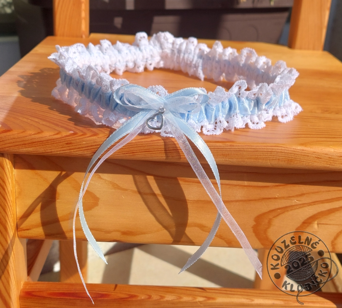 Jemný podvazek z jemné elastické krajky a saténové stuhy, zdobený mašličkou ze stužek a "stříbrným" přívěskem ve tvaru srdíčka.