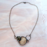 Náhrdelník starobylého vzhledu je vyroben z labradoritu s nádhernými zlatohnědými odlesky, z mnou vyrobeného keramického střepu, z mědi a cínu technikou cínování - tiffany. Celý přívěsek má rozměr 7x4cm a je zavěšen na 41cm dlouhém šedočerném řetízku s karabinkou. Kámen má drobné přírodní prasklinky - nejedná se o poškození nebo vadu kamene. Mimo řetízku a karabinky je vše ruční práce a jedná se o autorský šperk. Patinováno, ošetřeno antioxidantem.