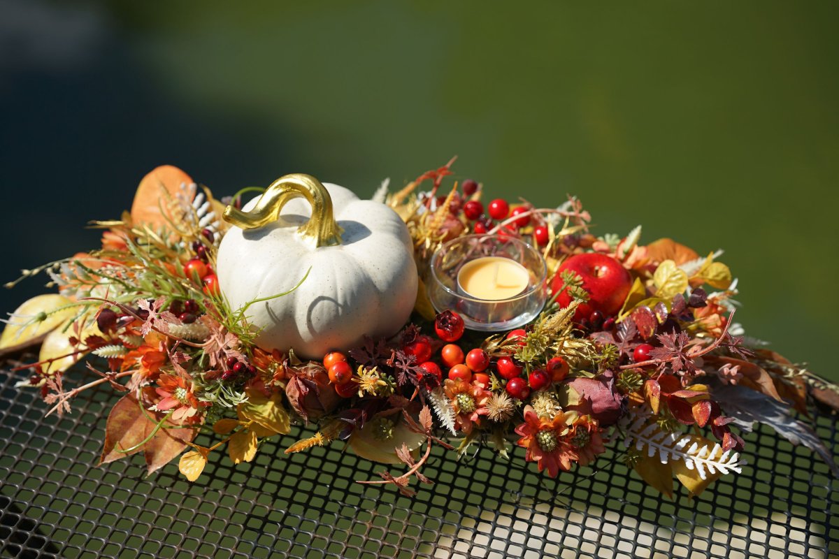 Podzimní dekorace na porcelánovém talíři. Materiál je trvanlivý, doplněný svícínkem na čajovou svíčku.