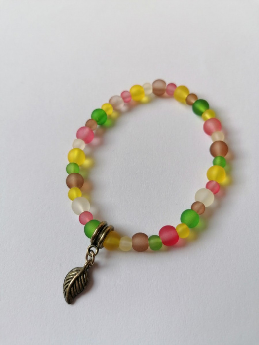 Náramek na pružence laděný do podzimu ze skleněných korálků a kovovým lístečkem. Obvod náramku je 17 cm.