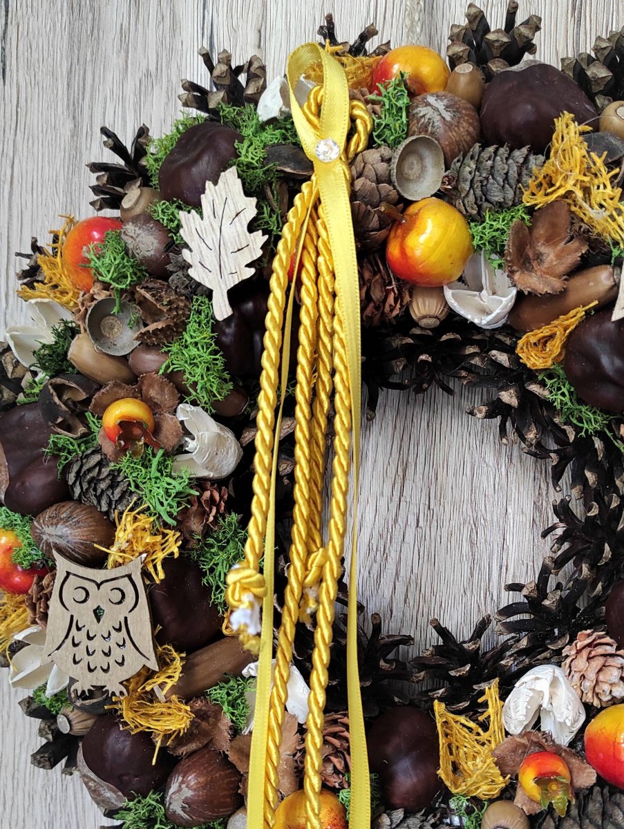 Krásný podzimní věnec laděný do podzimních barev, k zavěšení na stěnu nebo na dveře, průměr cca 28 cm. Je zhotoven ze sušených šišek, kaštanů, bukvic, žaludů a dalších druhů suchých plodů a ze stabilizovaného dovozového mechu. Je ozdoben umělými jablíčky, šípky a dalšími přízdobami.