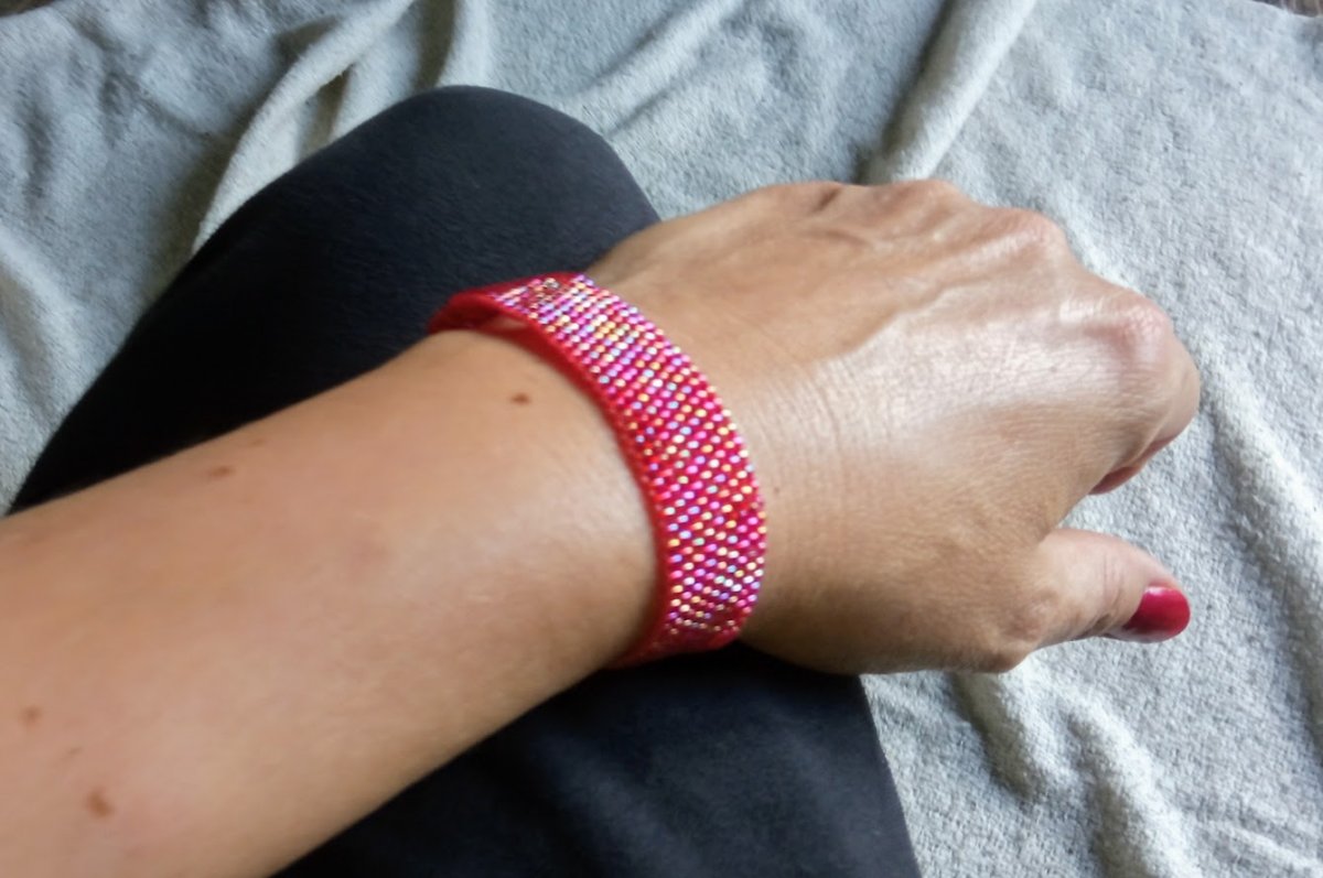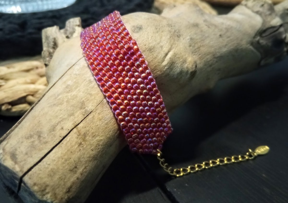 Ručně šitý z maličkých japonských skleněných korálků Toho - krásně růžových, lesklých, se zlato-duhovými odlesky.